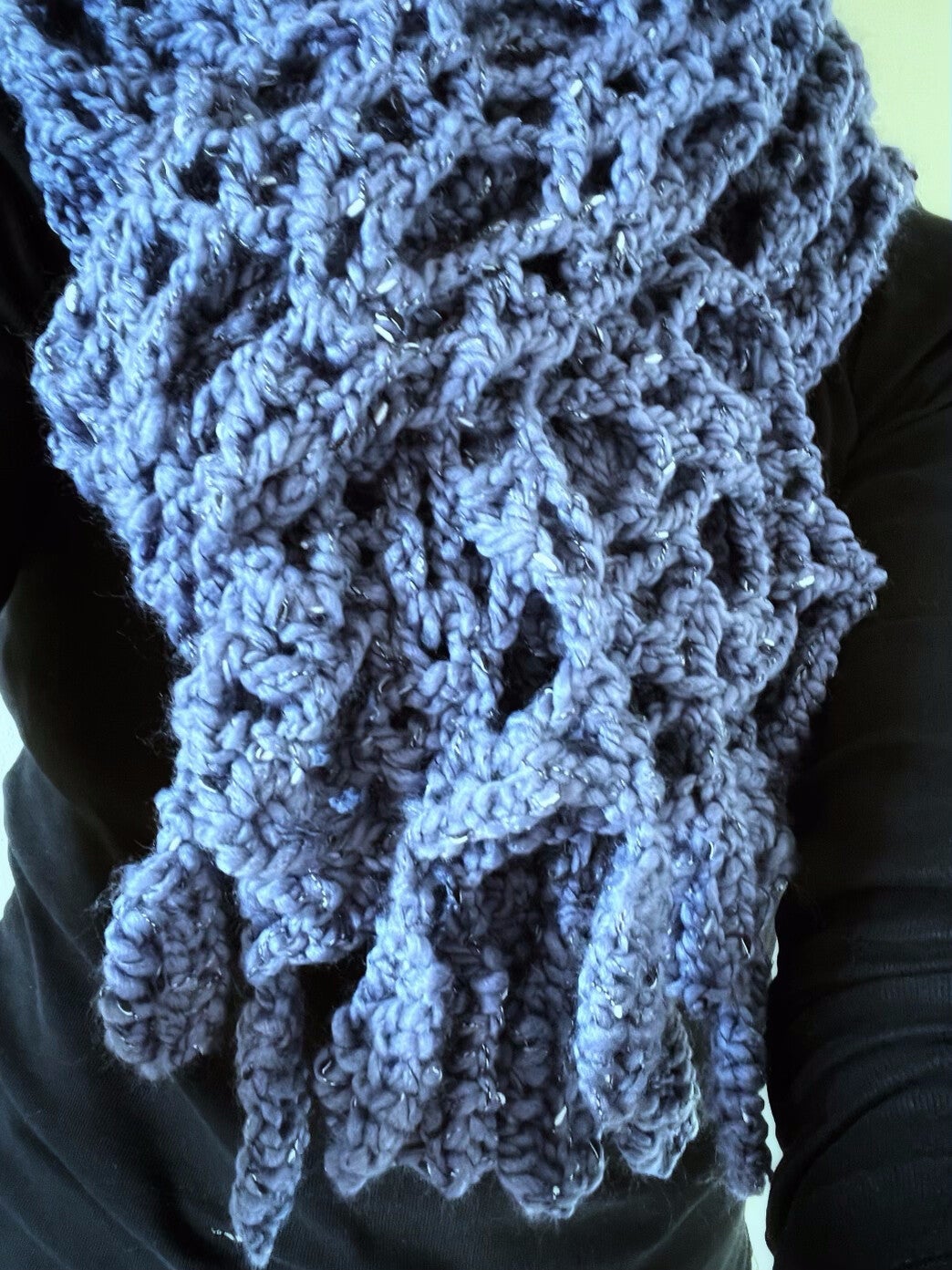 Knuffelzachte sjaal in een koesterende kleur en met een luchtig, kantachtig patroon. Heerlijke wintersjaal, extra lang. Door de kant-structuur ook zeer geschikt als stola of omslagdoek in tussenseizoenen of op een chilly zomeravond.