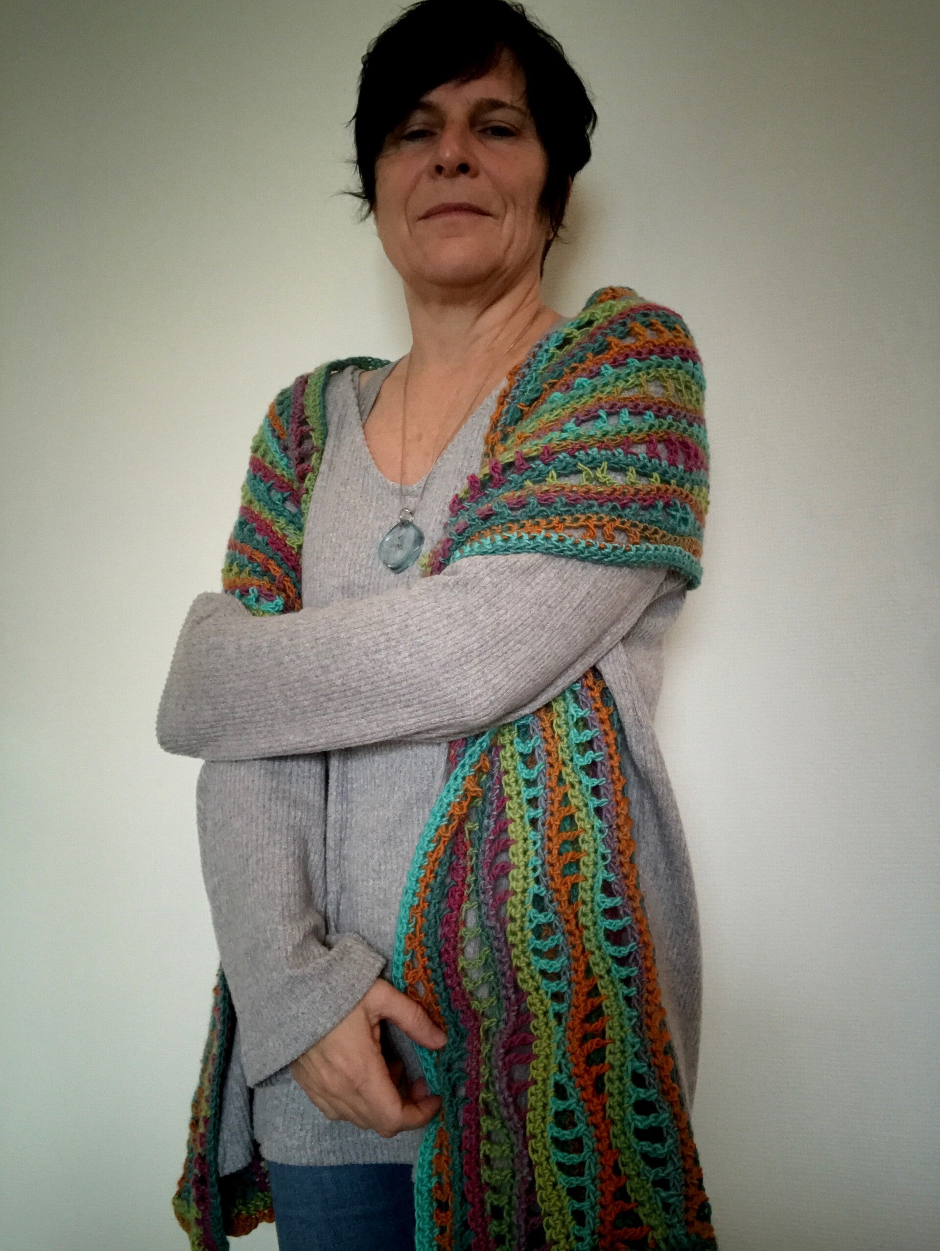 “River Flowing To The Sea”30% wol70% acrylLaaaaange sjaal, kan als een stola om de schouders worden gedragen op een zomeravond. Of rond de hals gewikkeld in de winter, héérlijk warm en koesterend.