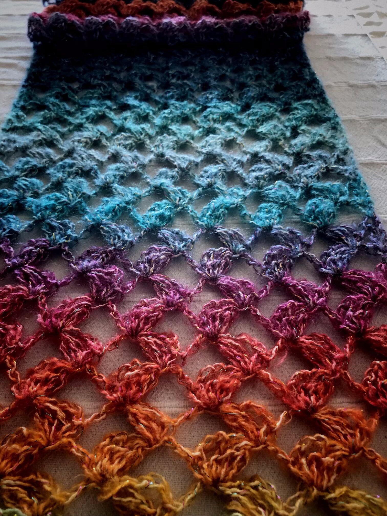 Krachtige, sprankelende kleuren, strelende overgang van kleur naar kleur en... verweven met een flinterdunne sprankeltjesdraad voor een iriserend effect.